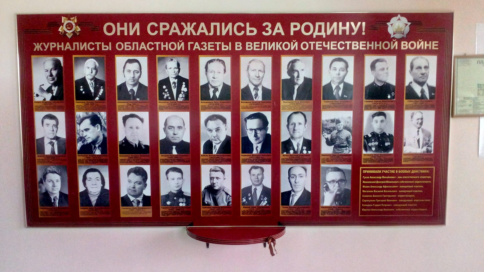 Напомним, что кроме этого Союз журналистов Липецкой области принимал активное участие и в других минутах памяти о тех, кто не молчал. Так, в крупнейшем в регионе медиа-холдинге областных печатных СМИ – Издательском доме «Липецкая газета» – с участием областной журналистской организации был изготовлен стенд «Они сражались за Родину». На нем около трех десятков ветеранов Великой Отечественной войны, работавших в редакции «Липецкой коммуны», затем «Ленинского знамени» и, наконец, «Липецкой газеты».